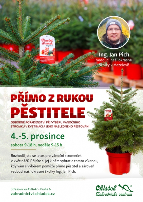 Rozhodli jste se letos pro vánoční stromeček v květináči? Přijďte si jej k nám vybrat o víkendu 4.-5. prosince (sobota 9:00-18:00, neděle 9:00-15:00), kdy vám s výběrem pomůže přímo pěstitel a zároveň vedoucí naší okrasné školky Ing. Jan Pich. Ceník a sortiment vánočních stromečků v květináči nalezenete zde.